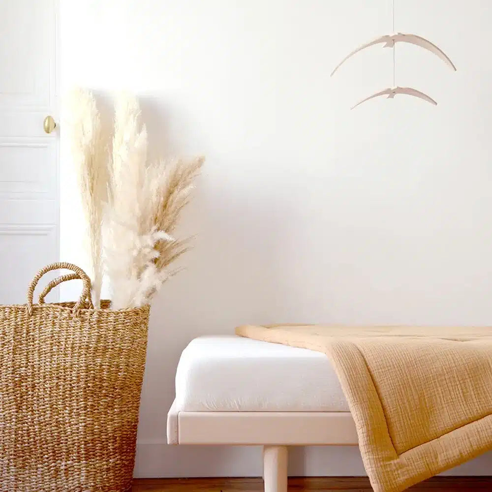 El móvil golondrinas aportará suavidad y poesía al nido del niño. Ideal con nuestro soporte de pared KANO o nuestra flecha de cama KANO, complementan la habitación del bebé con suavidad.